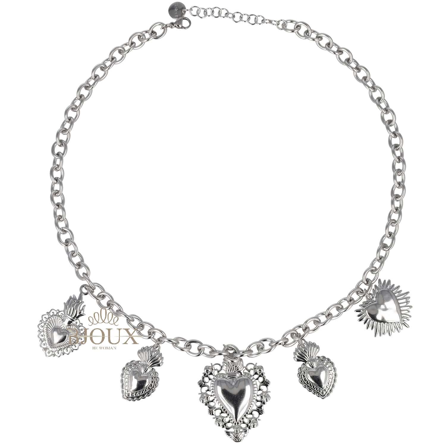 Collana in acciaio con maglia larga e cinque ciondoli a cuore decorato. Stile elegante e femminile, ideale per completare ogni look.