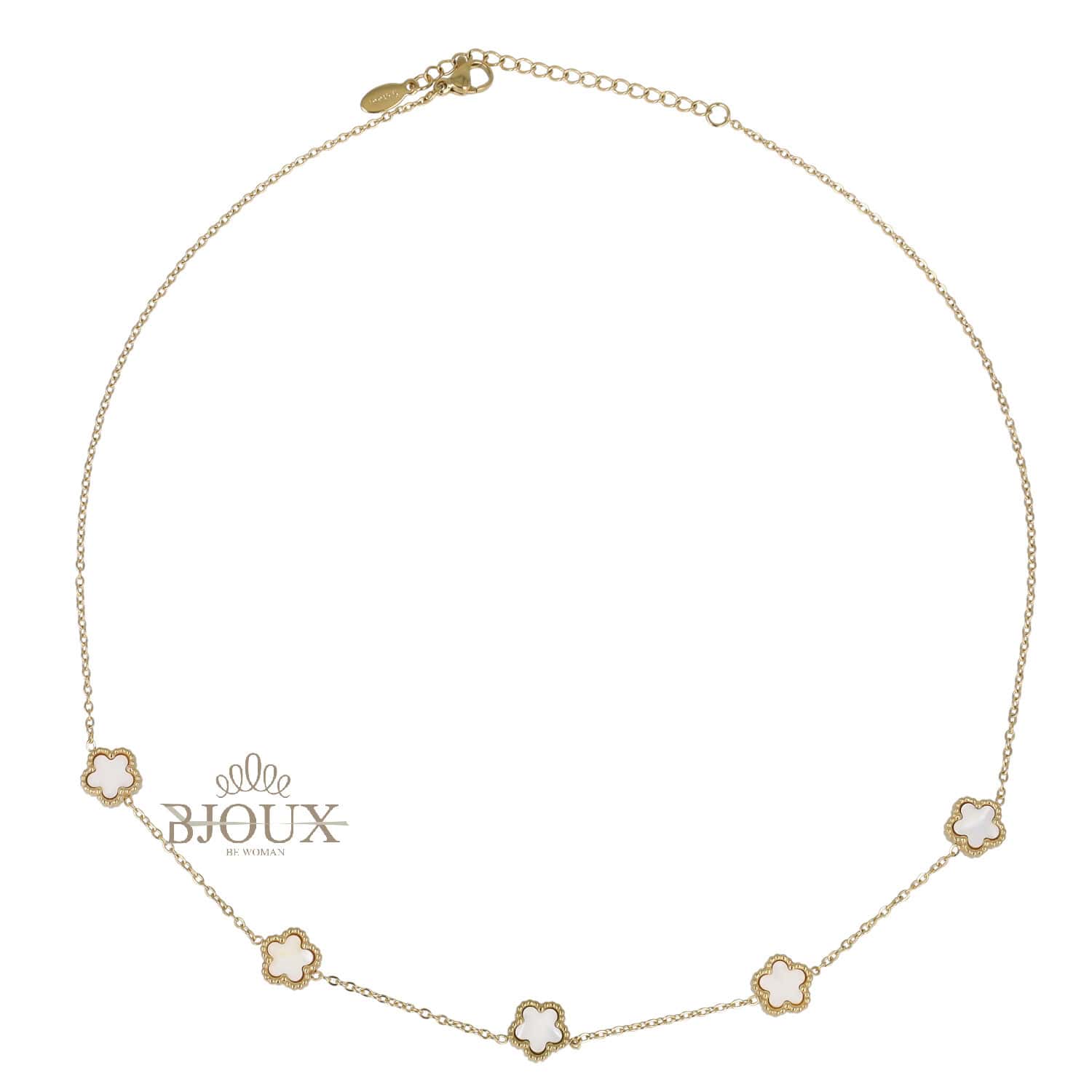 Collana catenina in acciaio inossidabile, 40+5 cm estensione. Girocollo con 5 fiorellini da 0,90 cm con interno colorato
