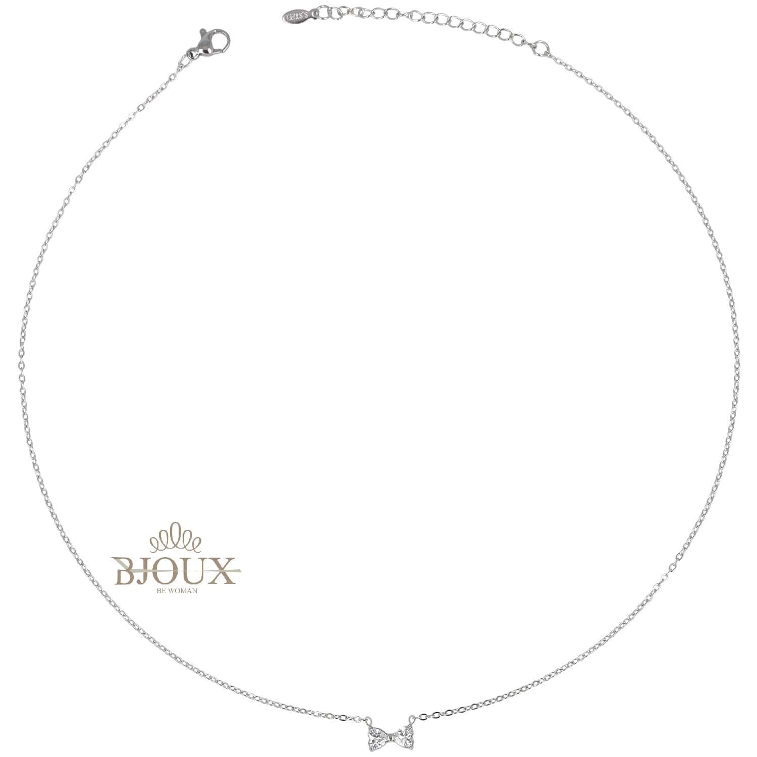 Collana in acciaio con ciondolo a fiocco, arricchito da zirconi bianchi. Un gioiello elegante e femminile.