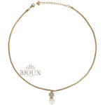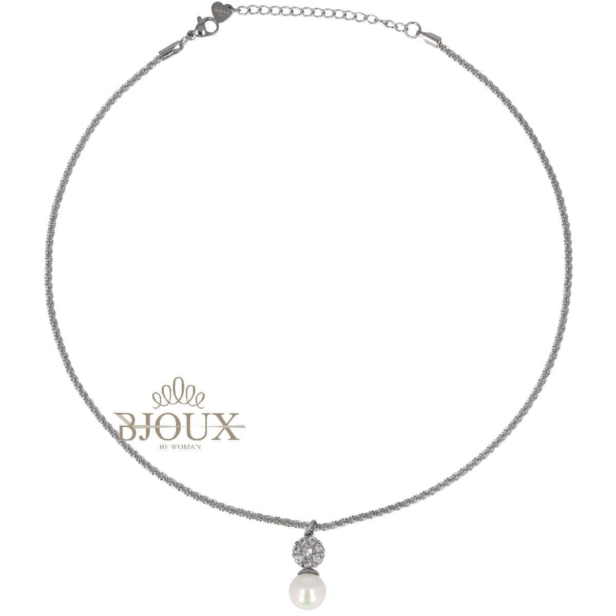 Collana donna in acciaio. Collana catena modello torchon con pendente composto da un piccolo fiore decorato con strass e una perla bianca finale