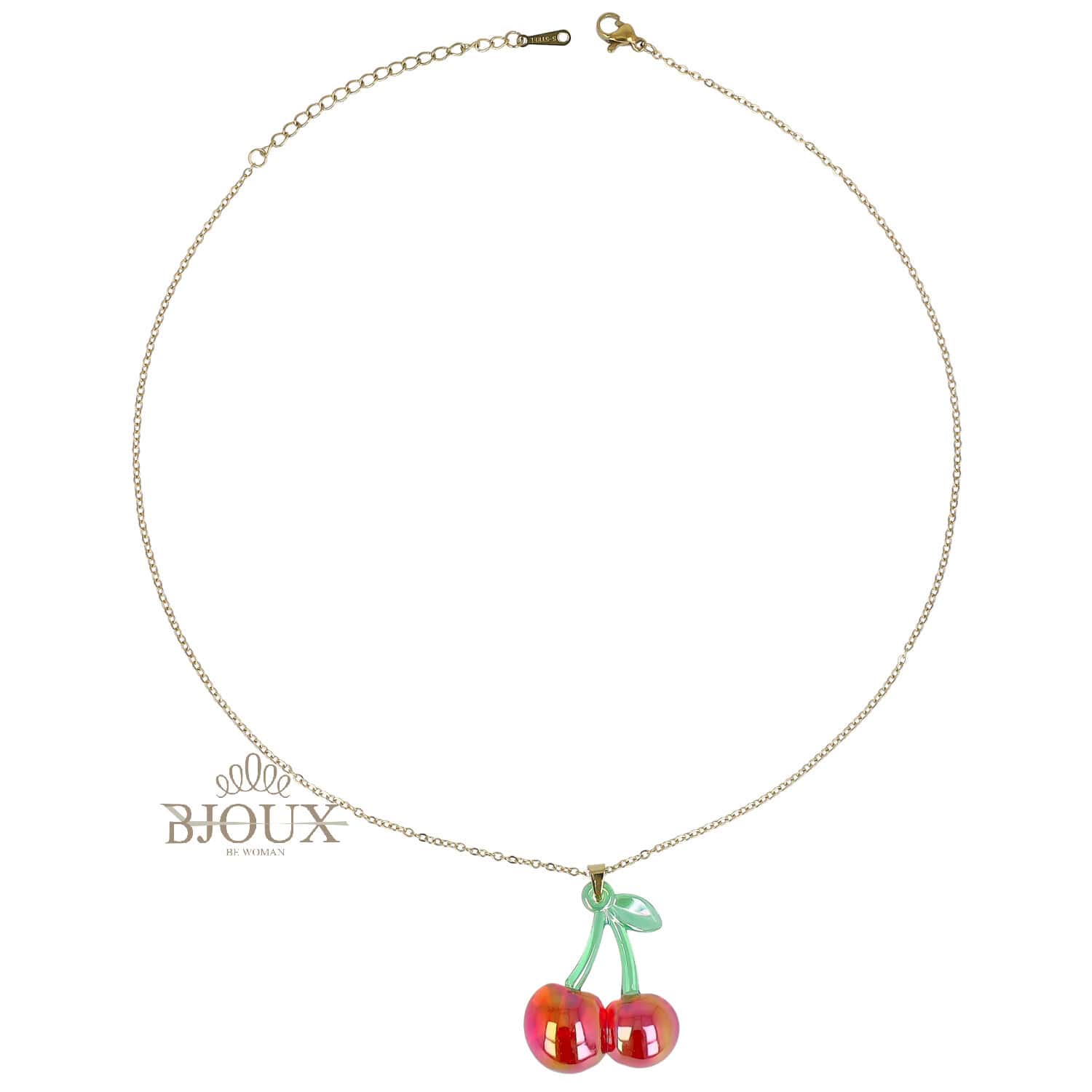 Collana catenina acciaio 40 + 5 cm di estensione con ciondolo ciliegie in acrilico colorato 3×2 cm