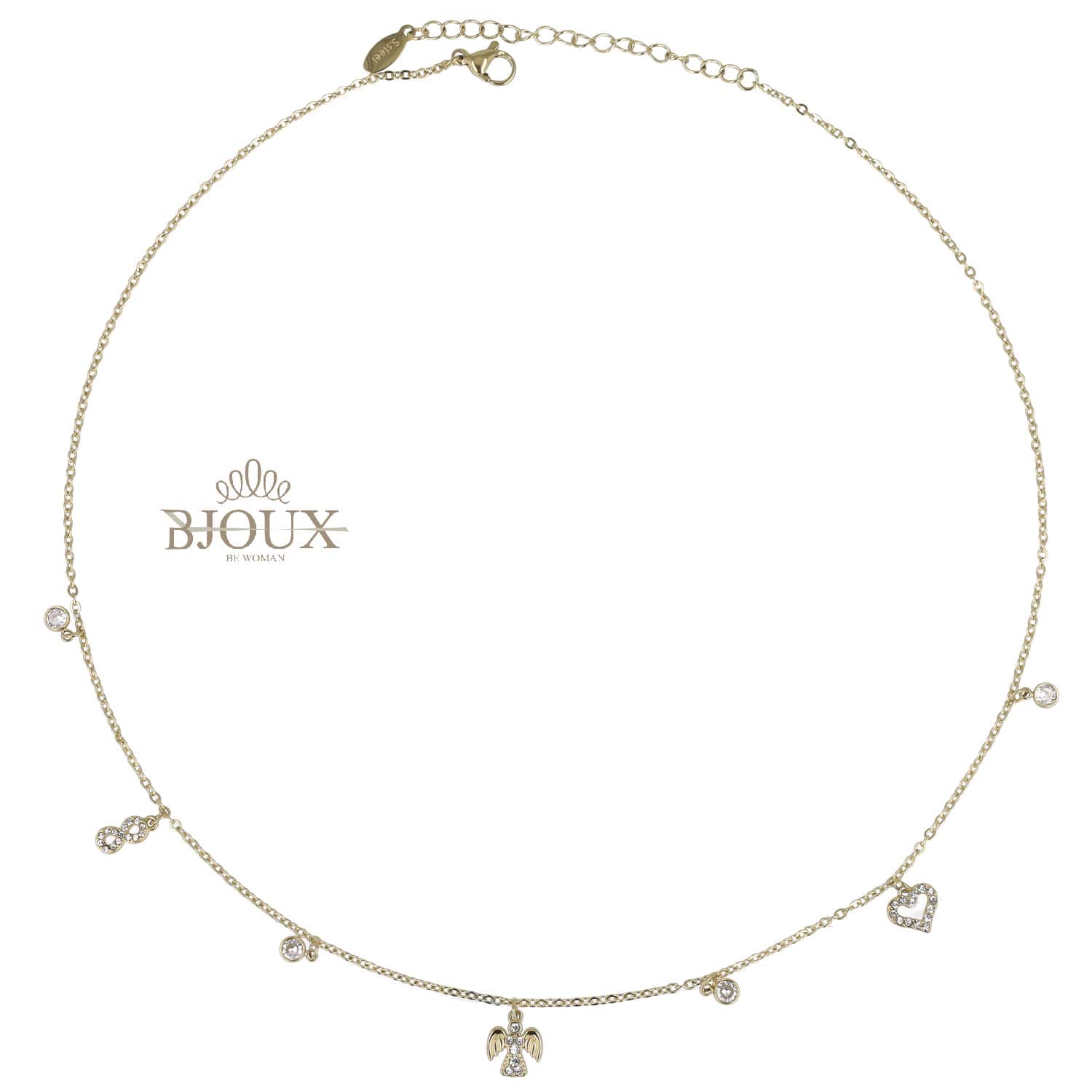 Collana bijoux in acciaio inossidabile, girocollo 37+5cm con charms decorati da strass e angioletto