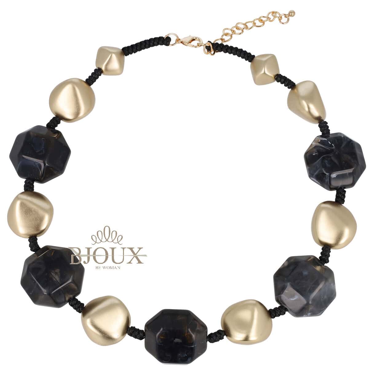 Collana girocollo con pietre tonde e ovali in acrilico black e smalto oro. Lunghezza 45 cm