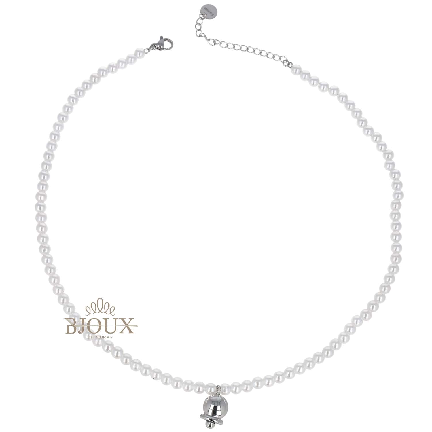 Collana di bigiotteria girocollo in perle bianche e chiusura acciaio da 40+5 cm con perdente campanella Capri da 1,5 cm.