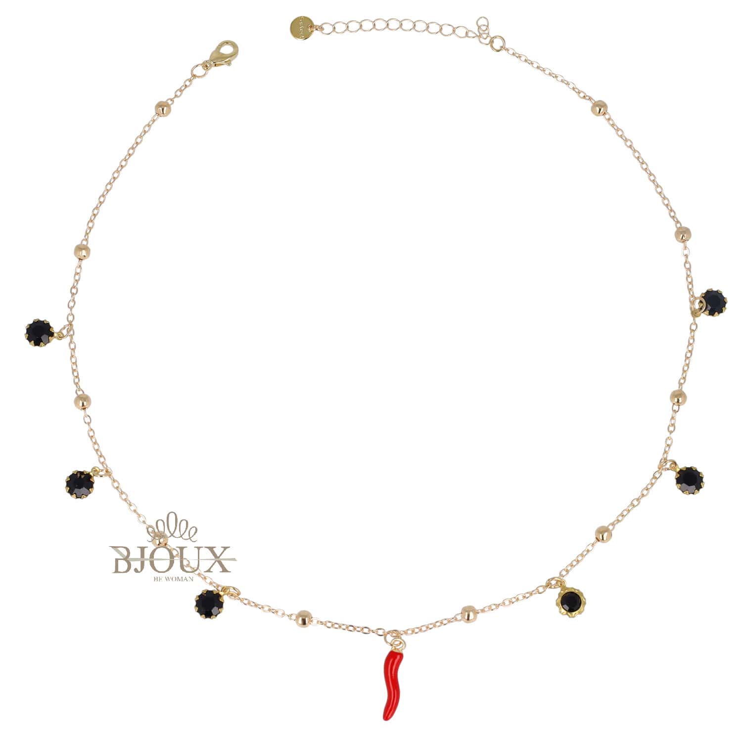 Collana bigiotteria con catenina in acciaio regolabile 40+5 cm , con ciondoli strass colorati e cornetto rosso