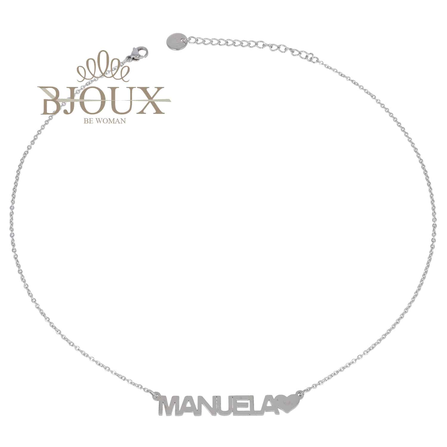 Collana a catenina in acciaio con chiusura a gancio. Diversi nomi disponibili in base alla lettera. Seleziona il tuo nome e aggiungi al carrello.Colore argento.