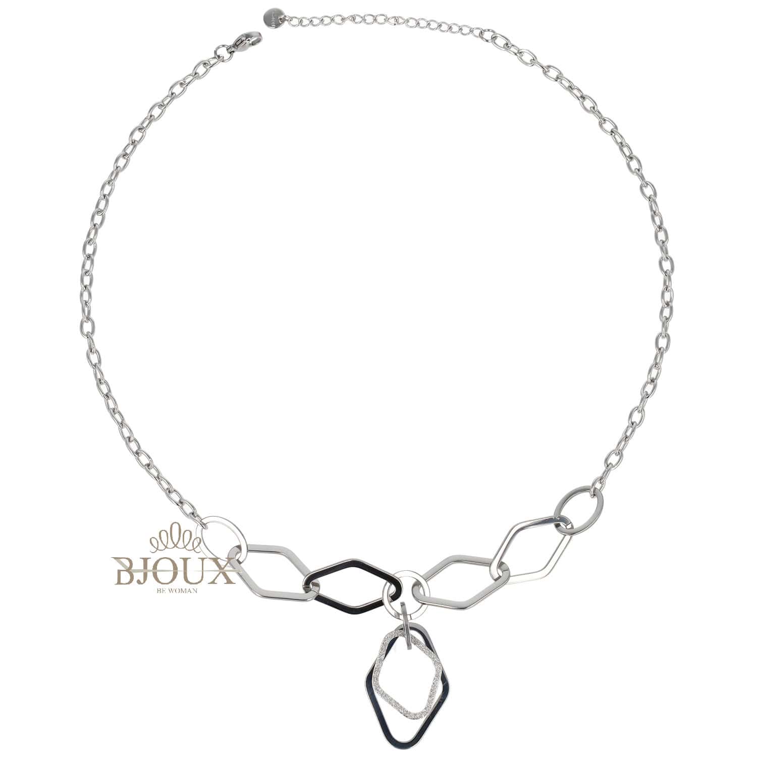 Collana girocollo in acciaio inox con catena a maglie geometriche e pendente a rombi doppi, uno liscio e uno glitter. Disponibile in oro e argento.