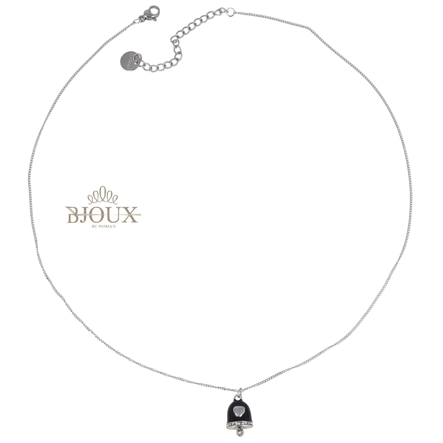 Collana di bigiotteria in acciaio inossidabileย con ciondolo portafortuna campanella smaltata con cuoricino centrale
