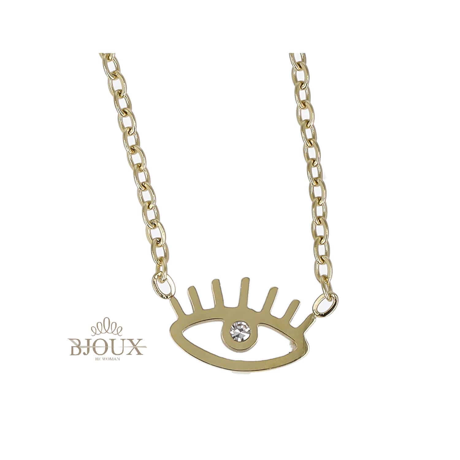 Collana cateninaย in acciaio inossidabile con centrale occhio con zirconi, disponibile in oro o in argento.