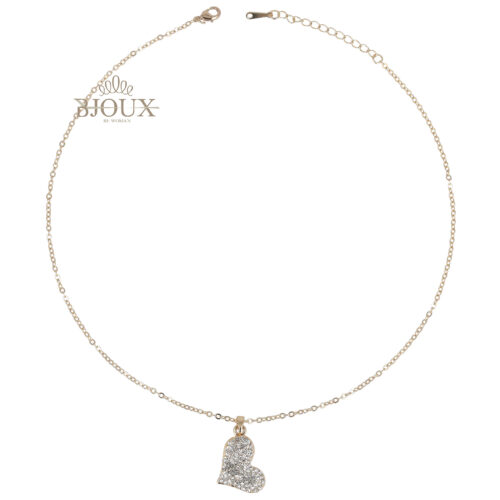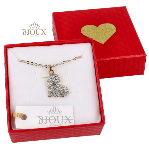 Collana di bigiotteria in ottone dipinto con pendente cuore decorato da zirconi. Lunghezza 20 cm + 5 cm estensione. Con astuccio 7×7