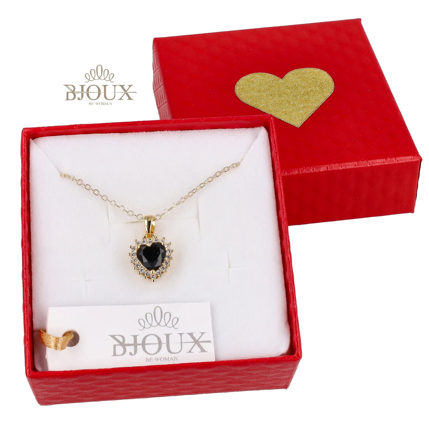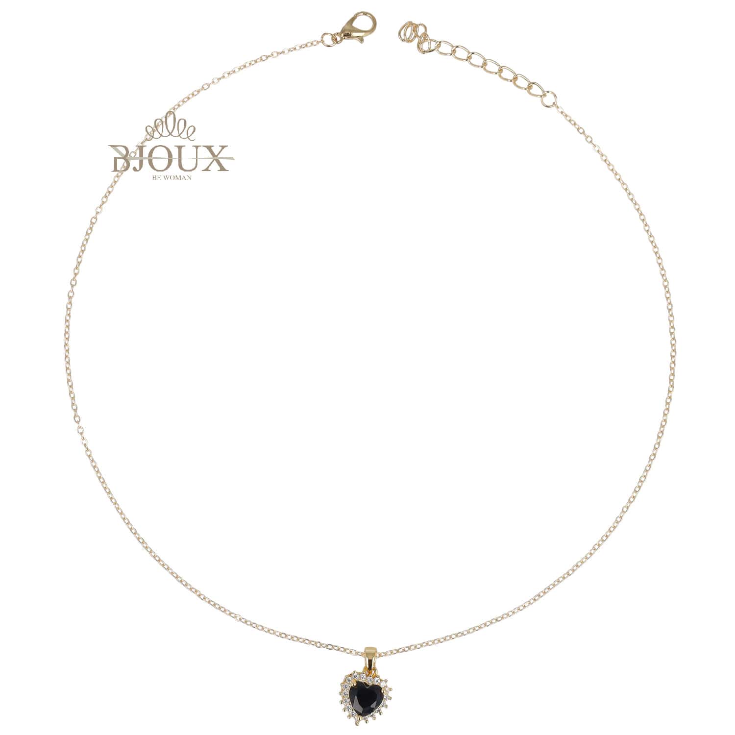 Collana di bigiotteria in ottone dipinto color oro con pendente cuore con strass e pietra centrale colorata. Con astuccio 7×7
