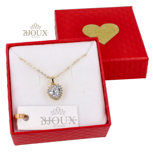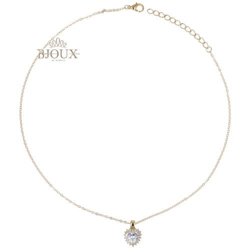 Collana di bigiotteria in ottone dipinto color oro con pendente cuore con strass e pietra centrale colorata. Con astuccio 7×7