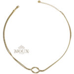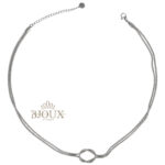 Collana donna in acciaio. Collana girocollo aย due filiย con maglia modelloย snake e ย unย nodo centrale intrecciatoย che unisce i due fili.