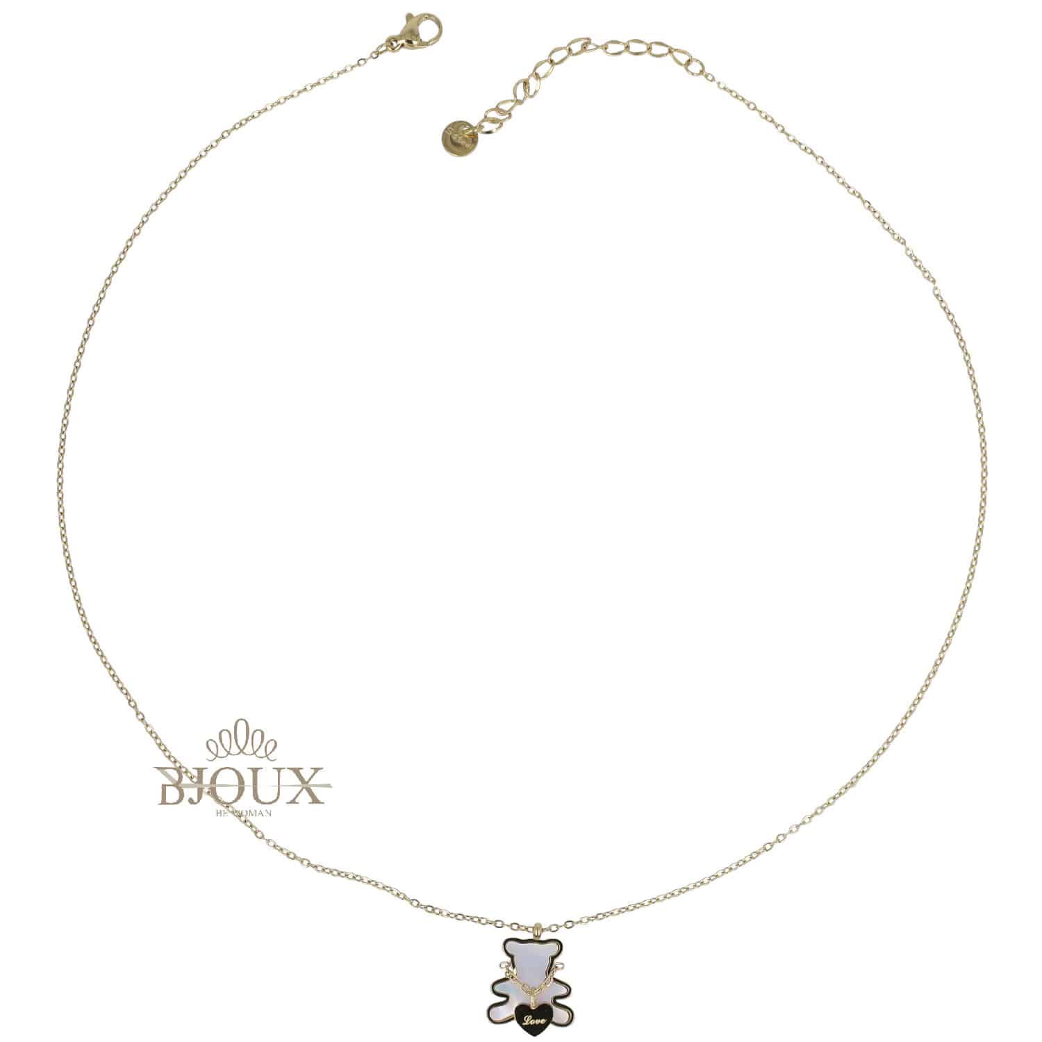 Collana da donna in acciaio inossidabile con ciondolo orsetto in madreperla e cuoricino inciso Love. Lunghezza 20cm + 5 cm estensione