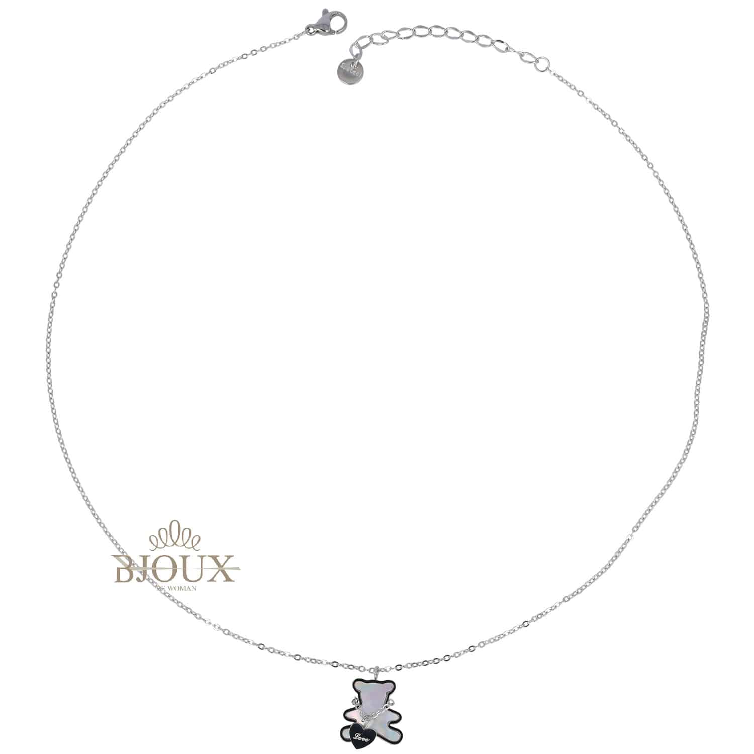 Collana da donna in acciaio inossidabile con ciondolo orsetto in madreperla e cuoricino inciso Love. Lunghezza 20cm + 5 cm estensione