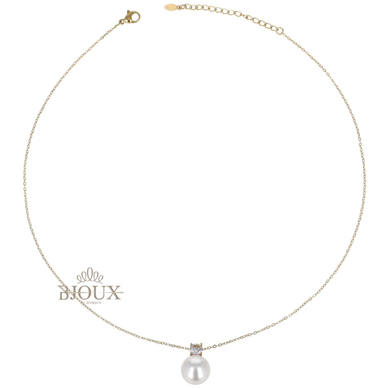 Collana in acciaio con ciondolo singolo a perla bianca, arricchito da zirconi nella parte superiore. Raffinata e senza tempo.