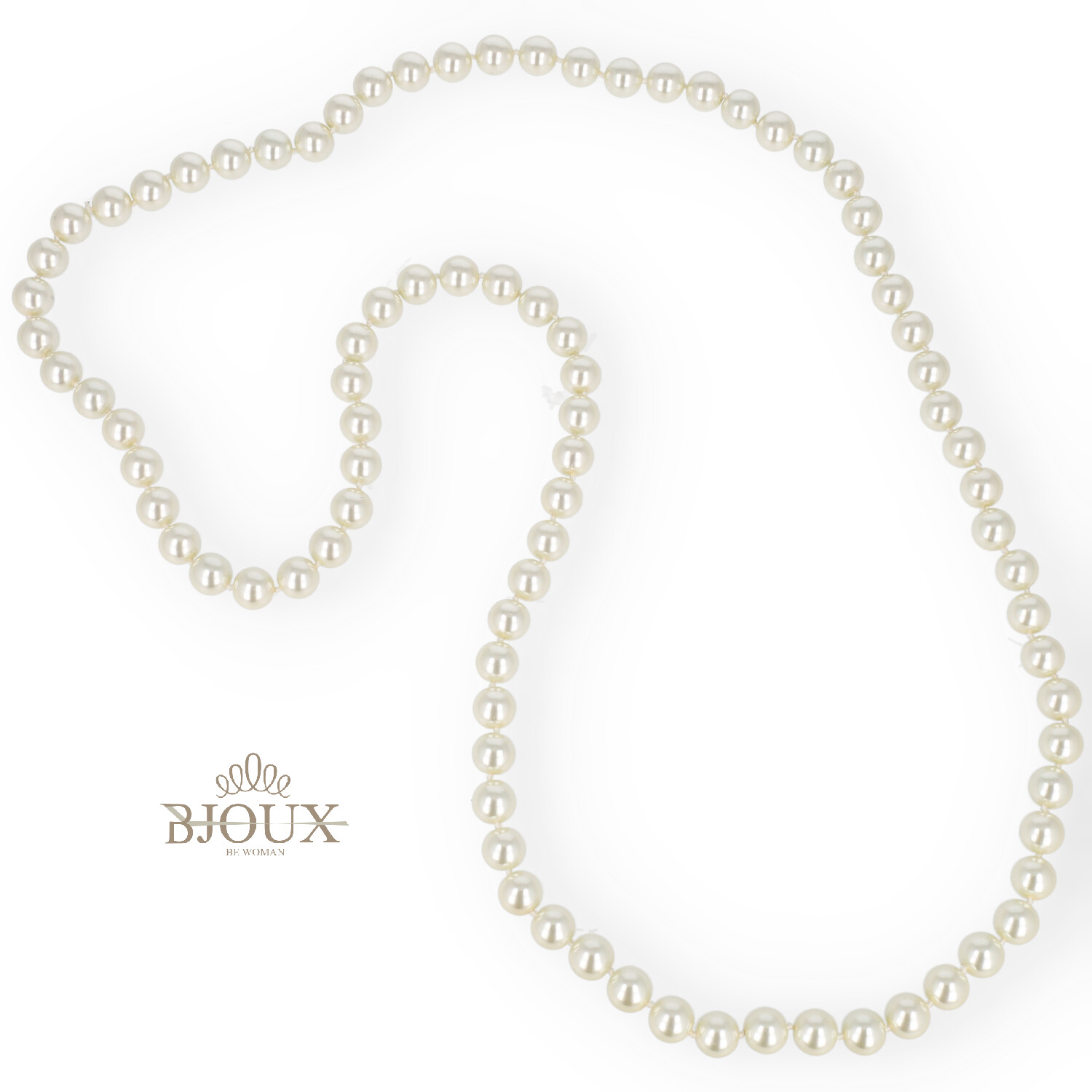 Collana lunga realizzata con perle in vetro da 10 mm, caratterizzate da una presenza importante e da una lucentezza intensa.