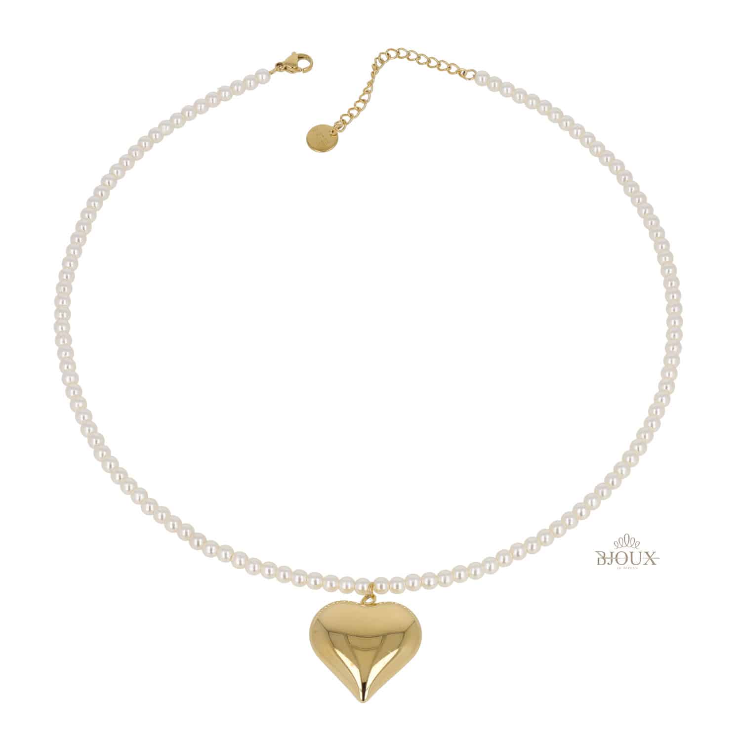 Collana di bigiotteria in acciaio inossidabile con perle bianche da 4mm e cuore bombato