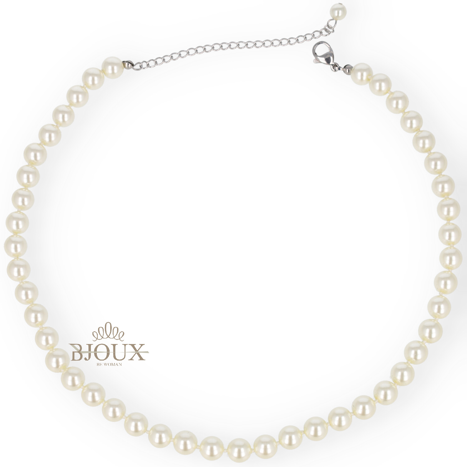 Collana realizzata con perle in vetro da 8 mm, caratterizzate da una brillantezza uniforme e da una dimensione elegante e ben visibile.