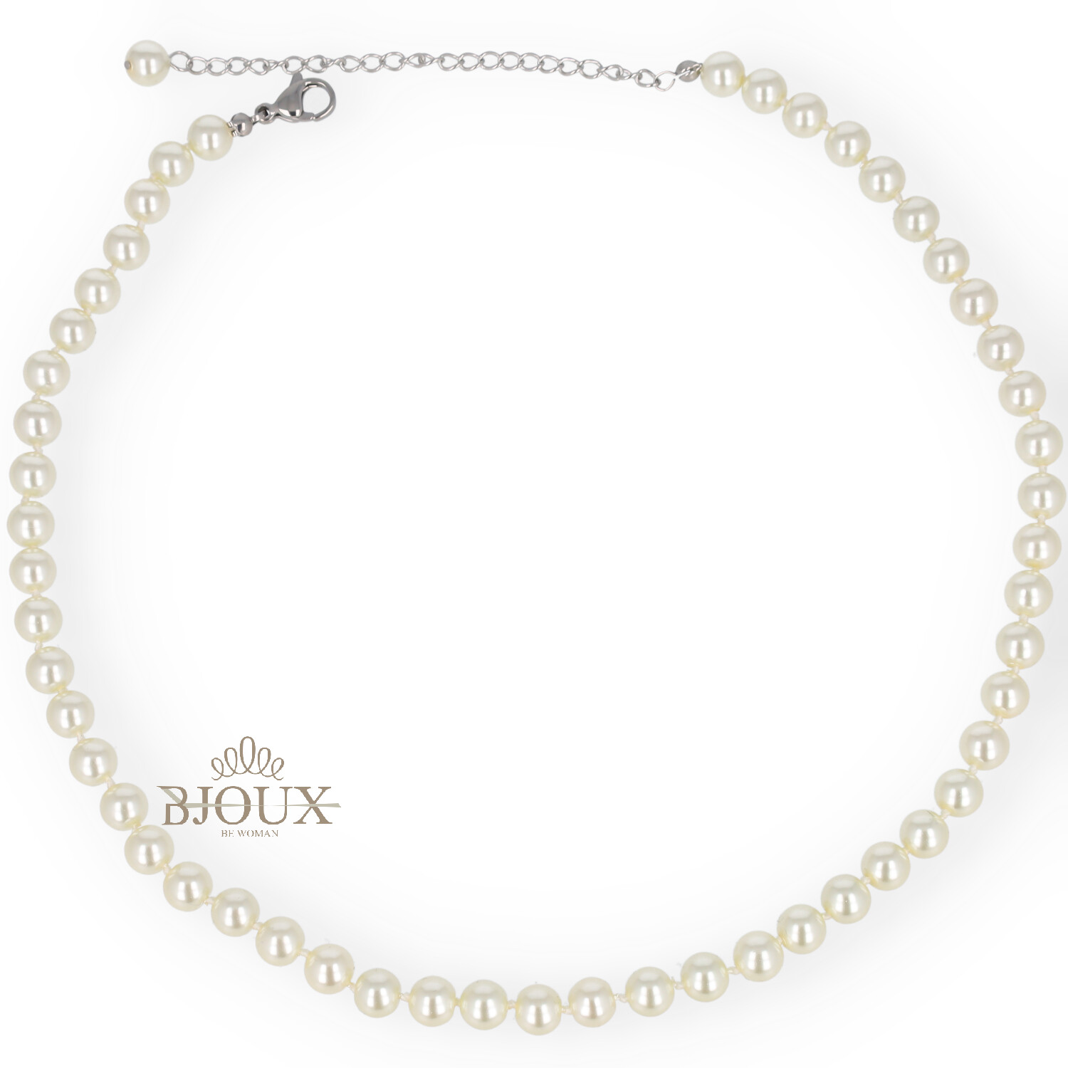 Collana realizzata con perle in vetro da 7 mm, caratterizzate da una brillantezza uniforme e da una dimensione perfettamente bilanciata tra eleganza e presenza.