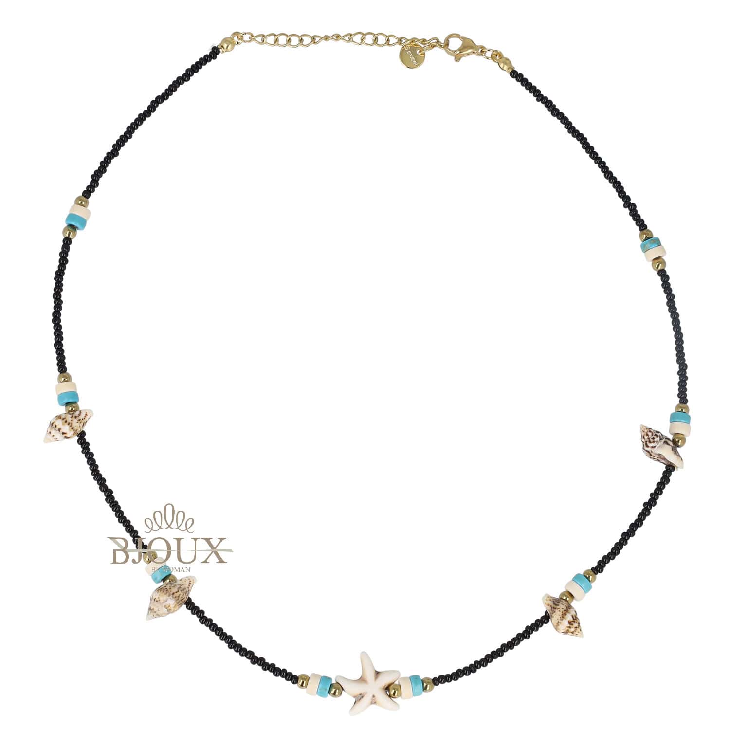 Collana bigiotteria in acciaio inossidabile con estensione, composta da perline colorate , pietre turchesiย con conchiglie e stella marina centrale