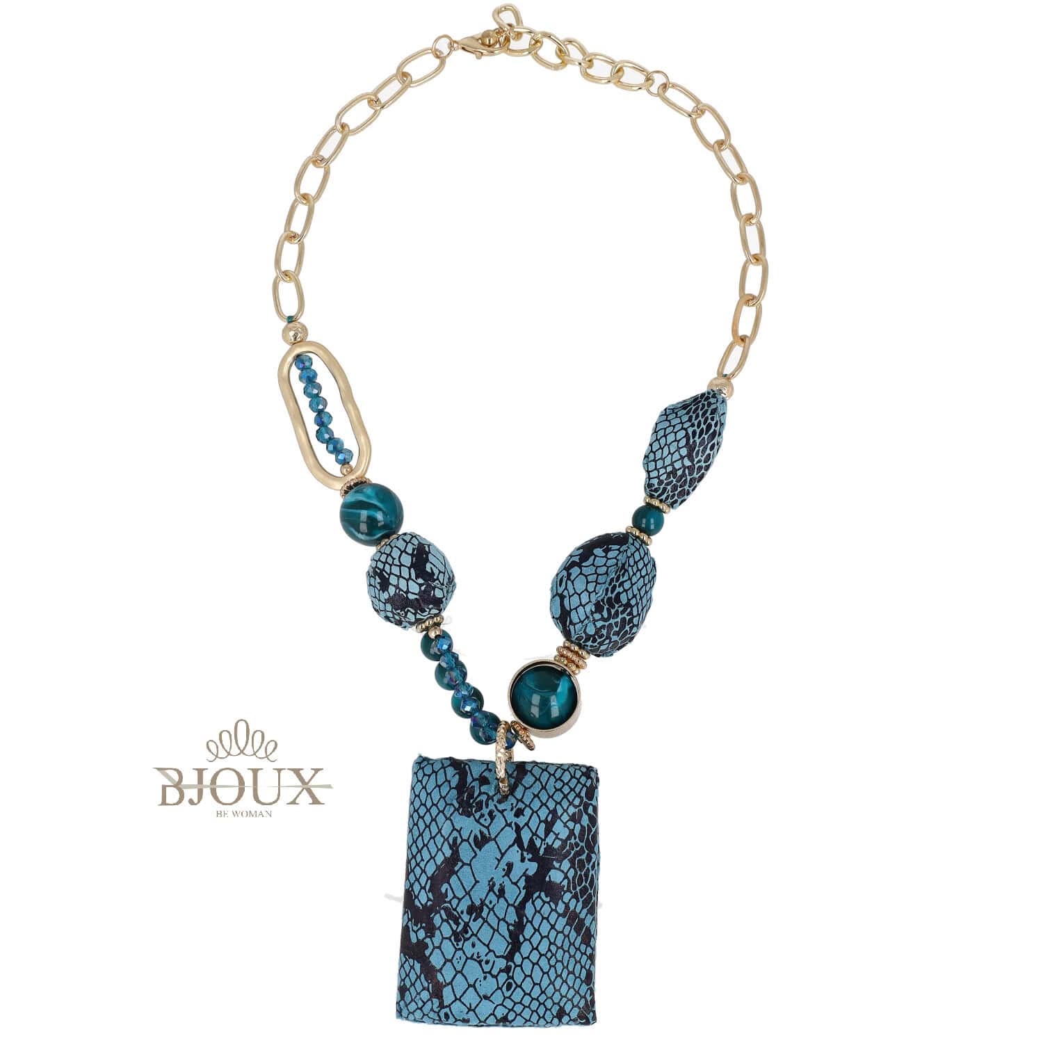 Collana effetto pitonato nei toni del blu con catena dorata e perle coordinate. Perfetta per un look deciso e originale.