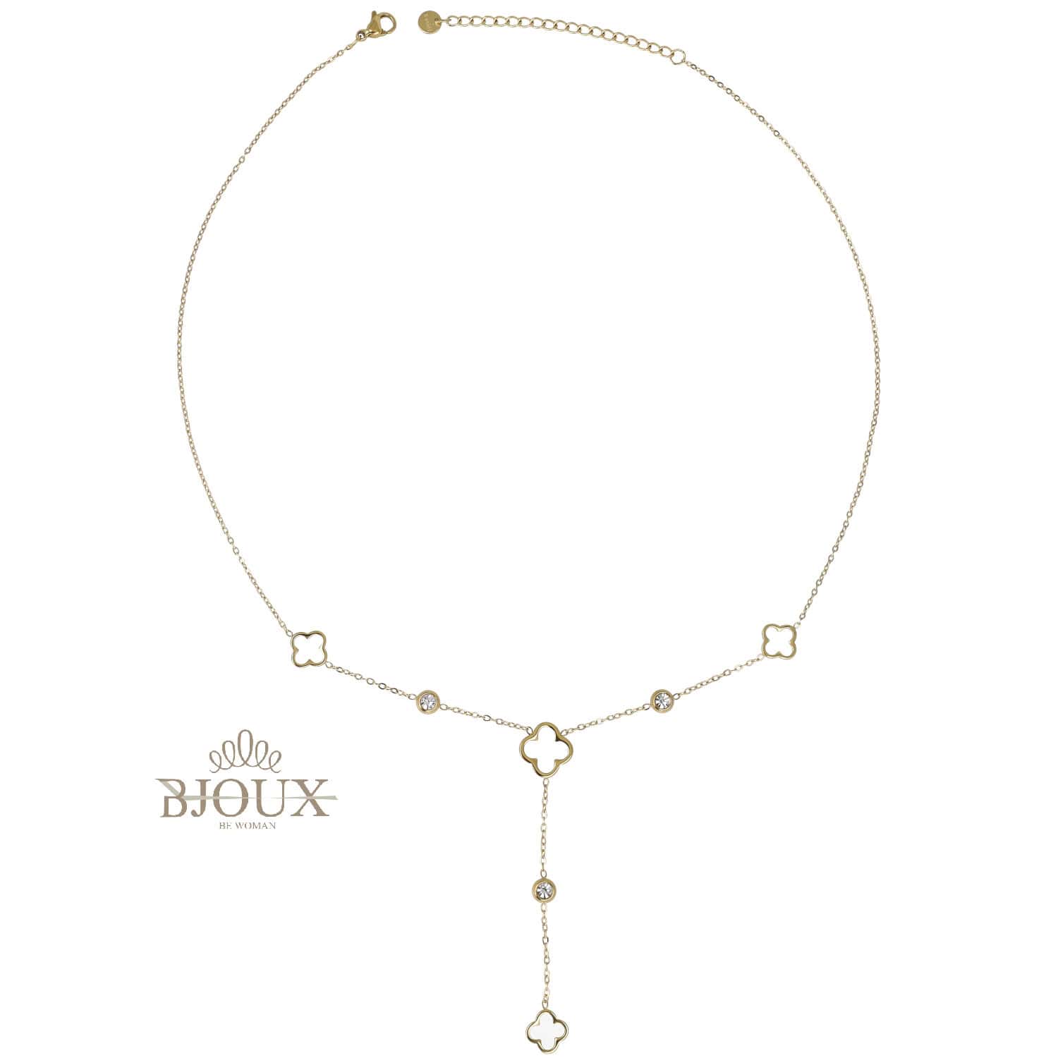 Un gioiello raffinato e portafortuna allo stesso tempo. Questa collana in acciaio alterna delicati elementi a forma di quadrifoglio e piccoli zirconi luminosi che impreziosiscono il design.