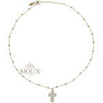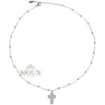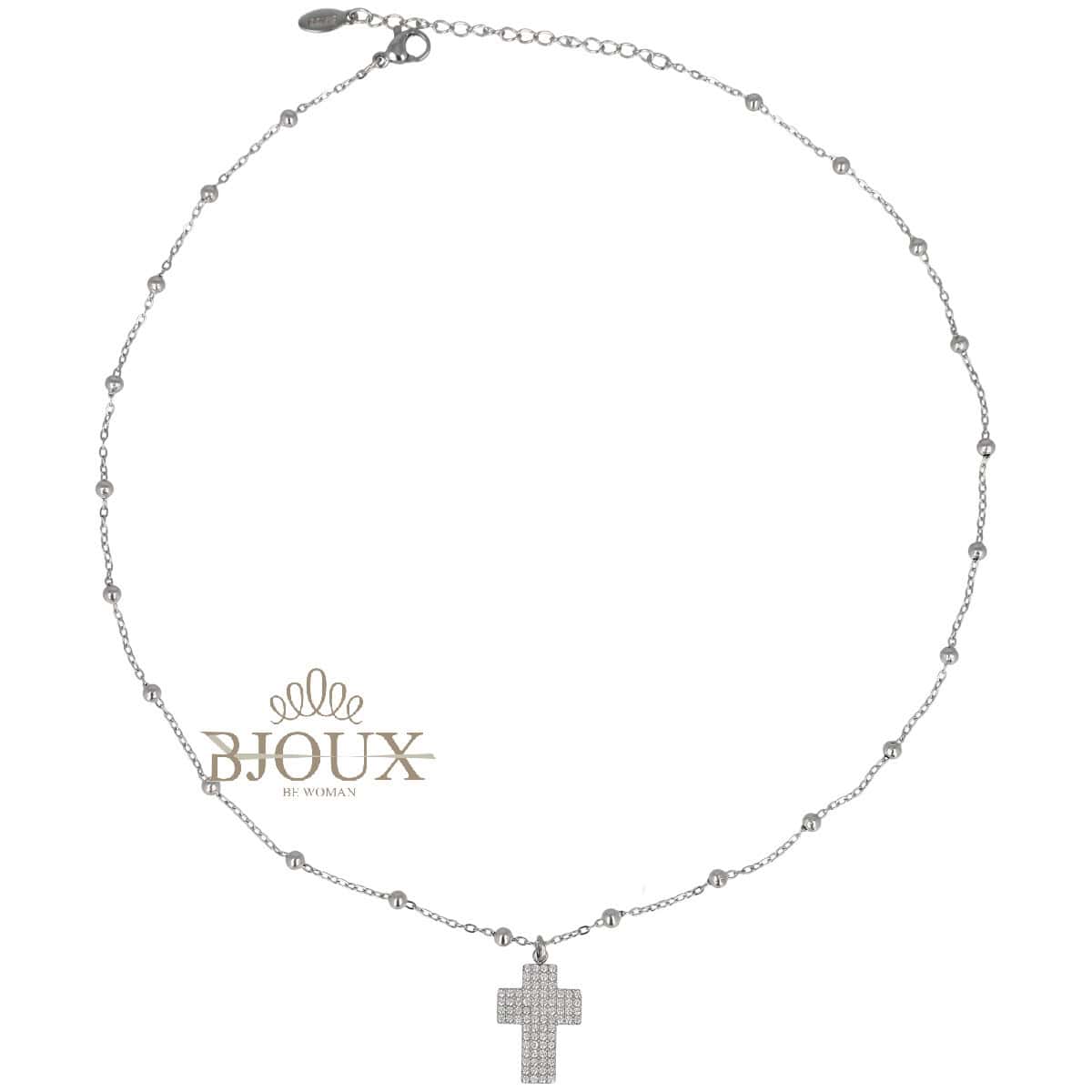 Collana donna in acciaio. Collana catenina sottile e maglia arricchita da piccole sfere distanziate in stile collana rosario con ciondolo croce con strass brillanti.