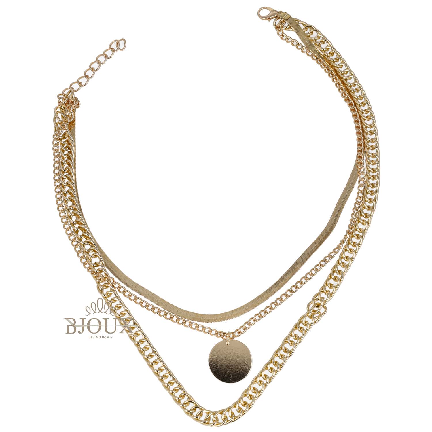 Collana di bigiotteria in ottone catena 36+5 cm estensione. Groumette dipinta color oro a tre fili con snake e catena e ciondolo pendente