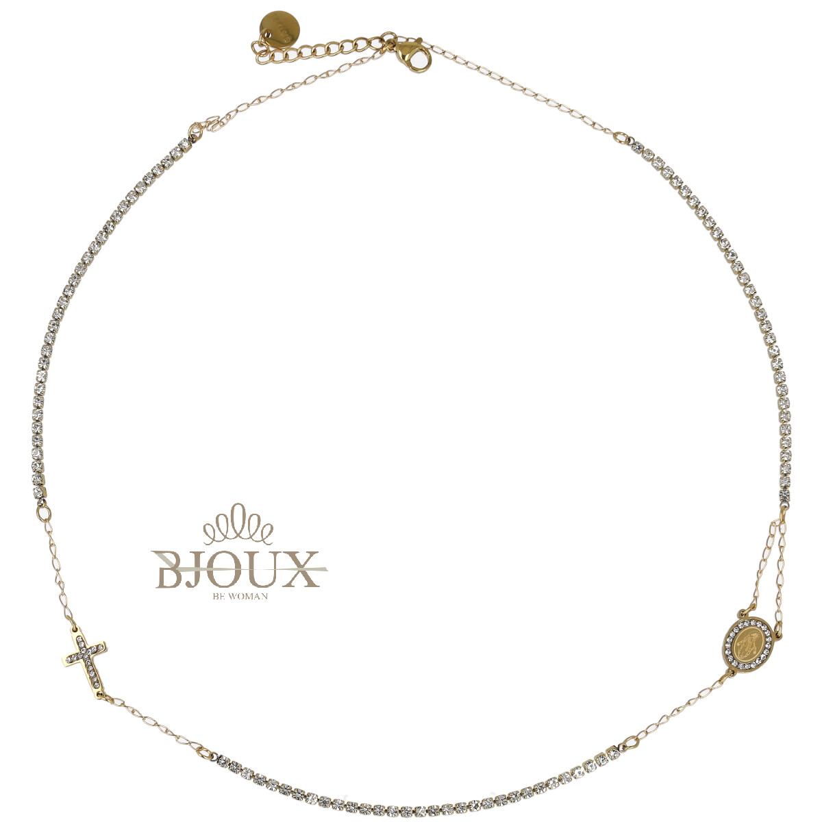La collana tennis Rosario è una collana a girocollo composta da una fila continua di zirconi incastonati . Le medagliette sono laterali anch’esse decorate da strass.
