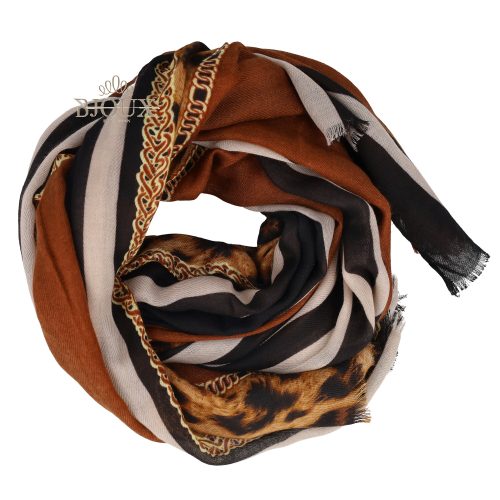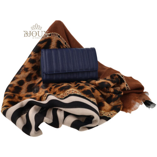 Idea regalo composta da un foulard tessuto colorato a fantasia . Composizione 20% viscosa 80% cotone. misure 90ร190 con portafoglio con scomparti effetto trapunta