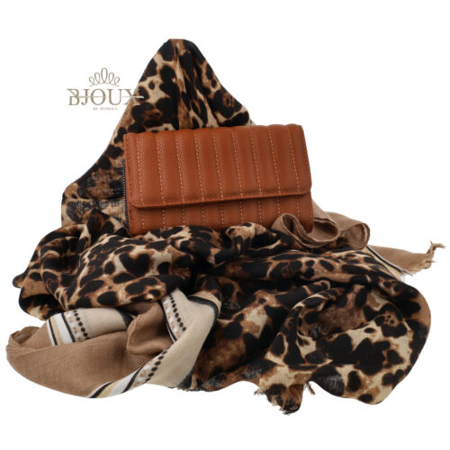 Idea regalo composta da un foulard tessuto colorato a fantasia . Composizione 20% viscosa 80% cotone. misure 90ร190 con portafoglio con scomparti effetto trapunta