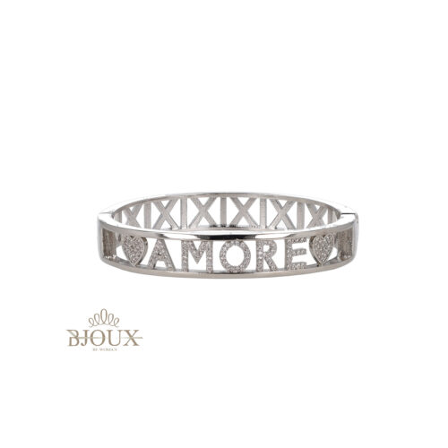 Bracciale da donna in ottone rodiato. Modello rigido a manetta con scritta in strass.