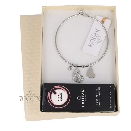 Confezione regalo composta da bracciale acciaio con ciondoli cuori strass abbinato al profumo 15 ml ย ispirato a La Vie Est Belle