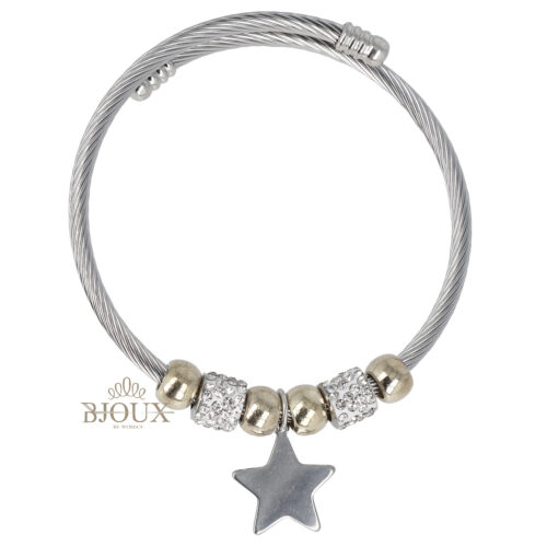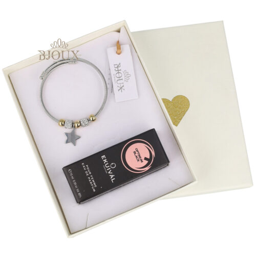 Confezione regalo per donna composta da bracciale in acciaio a spirale, beads con strass e pendente abbinato al profumo 15 ml ispirato a Black Opium YSL.