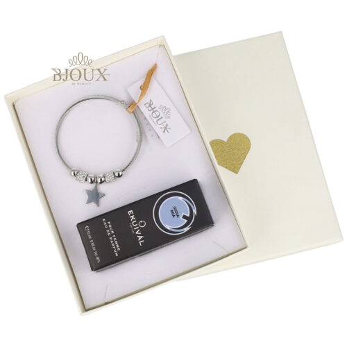 Confezione regalo per donna composta da bracciale in acciaio a spirale, beads con strass e pendente abbinato al profumo 15 ml ispirato a Armani Acqua di Gioia.