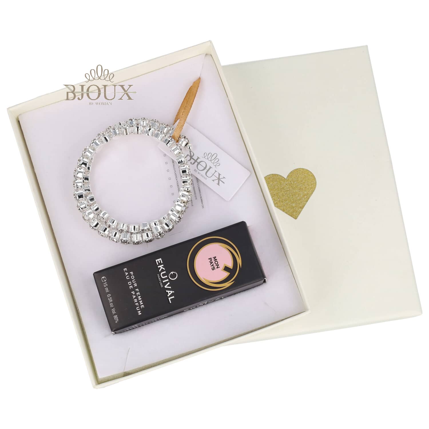 Confezione regalo per donna composta da bracciale in acciaio a spirale con strass abbinato al profumo 15 ml ispirato a Mon Paris di Y.S.Laurent .