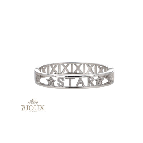 Bracciale da donna in ottone rodiato. Modello rigido a manetta con scritta in strass.