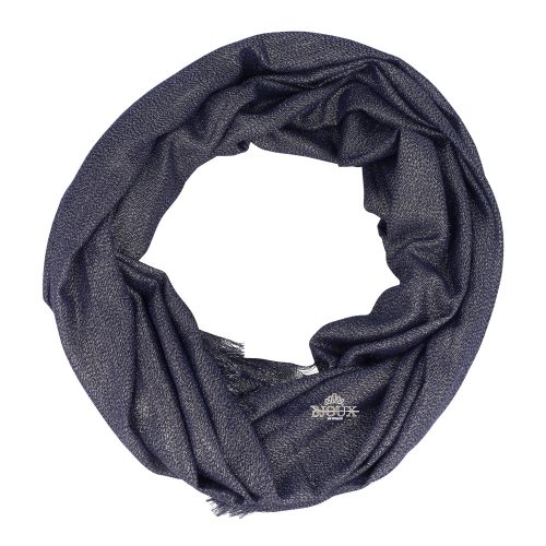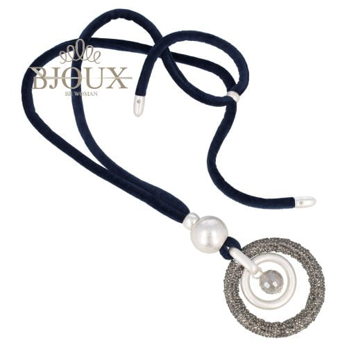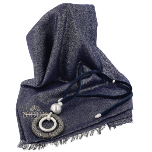 Idea regalo composta da stola in tessuto lurex con glitter, 50% viscosa 30%silk 20% cotton . Misure 200×80 con collana con cordino blue in velluto e perla con tondo strass.