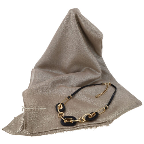 Idea regalo composta da stola in tessuto lurex con glitter, 50% viscosa 30%silk 20% cotton . Misure 200×80 con collana pelle nera con elementi geometrici.