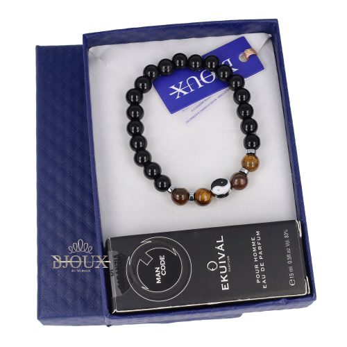 Confezione regalo per uomo composta da bracciale elastico con sfere blackย e simbolo yin yang abbinato al profumo 15 ml ย ispirato a Black Code di Armani
