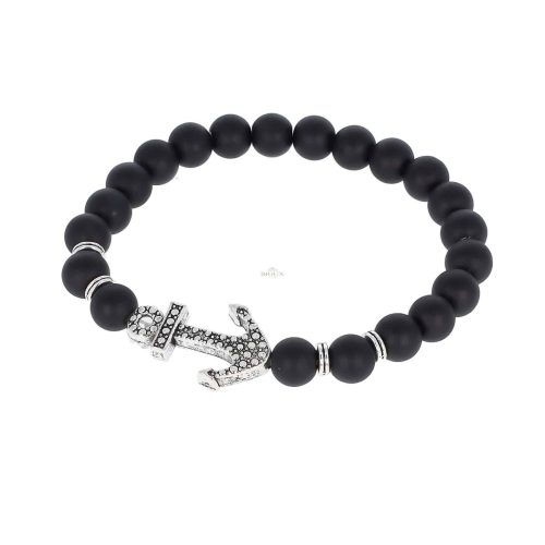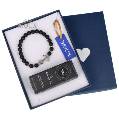 Confezione regalo per uomo composta da elastico con sfere nere e ancora metallo abbinato al profumo 15 ml ispirato a Armani Black Code ย .