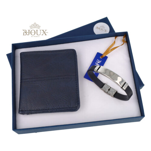 Confezione regalo per uomo composta da bracciale in cuoio con targa in acciaio inossidabile abbinata al portafogli uomo in ecopelle 10,5×9 cm