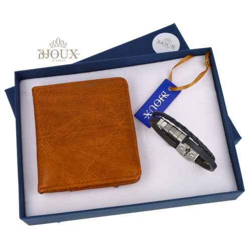 Confezione regalo per uomo composta da bracciale in cuoio con targa in acciaio inossidabile abbinata al portafogli uomo in ecopelle 10,5×9 cm
