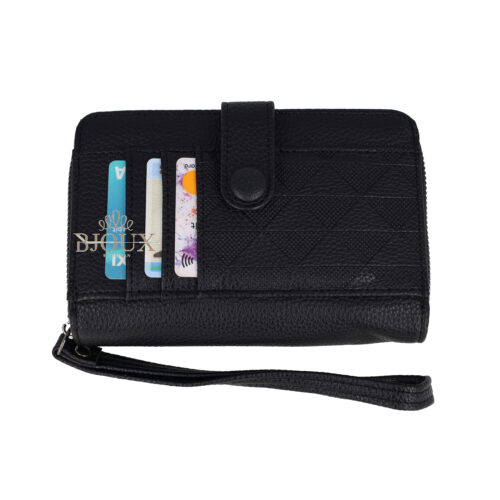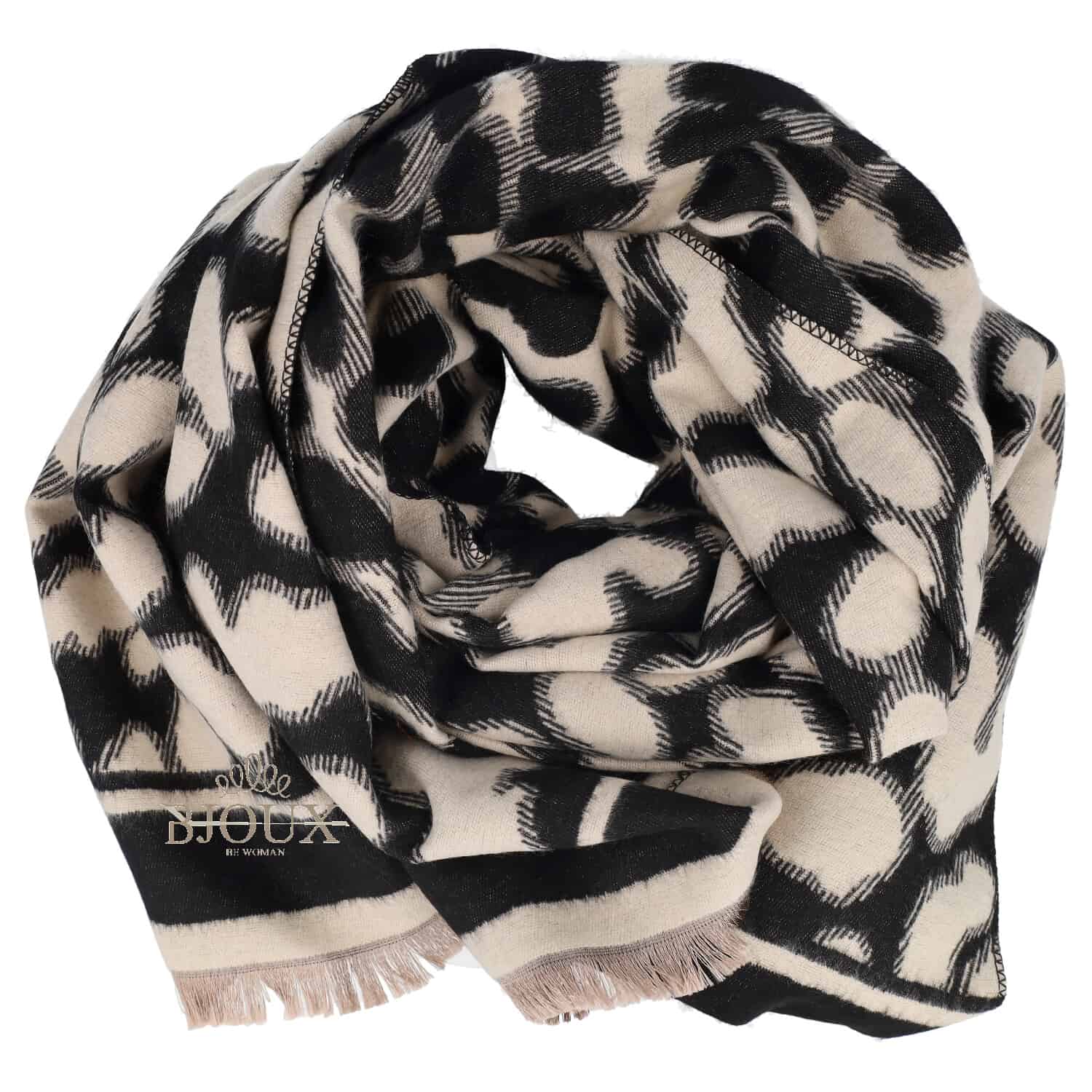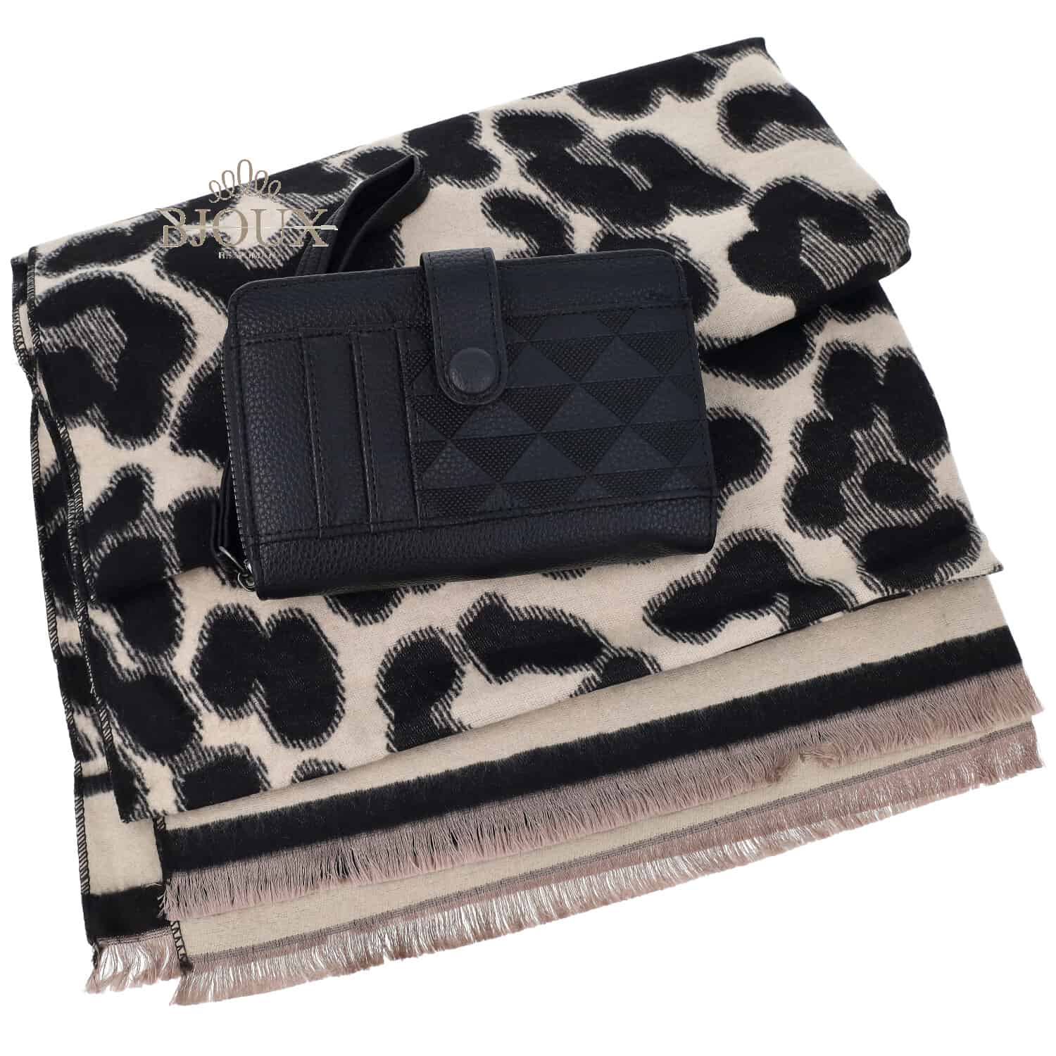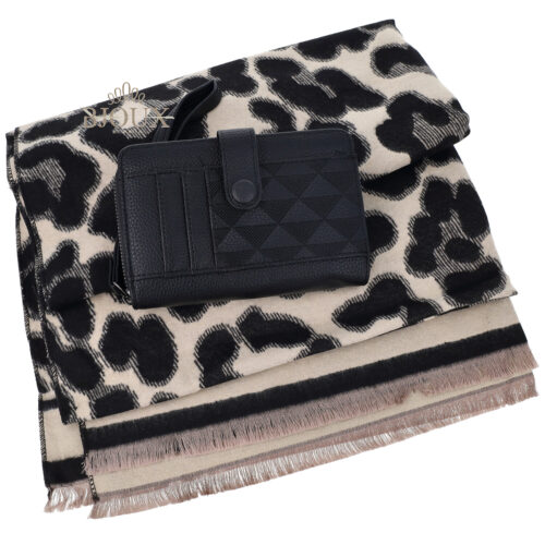 Idea regalo composta da una sciarpa da donna con frange a fantasia . Misure 180ร75. Composizione 50% viscosa 30% cashmere 20% lana con portafoglio con scomparti effetto trapunta