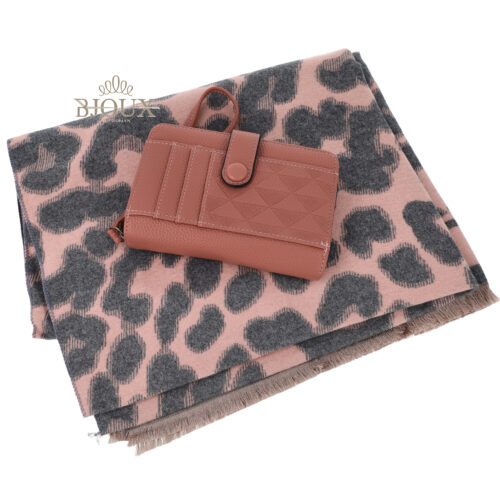 Idea regalo composta da una sciarpa da donna con frange a fantasia . Misure 180ร75. Composizione 50% viscosa 30% cashmere 20% lana con portafoglio con scomparti effetto trapunta