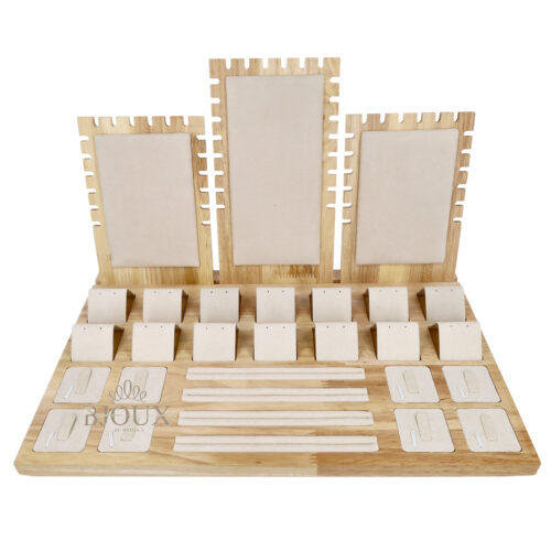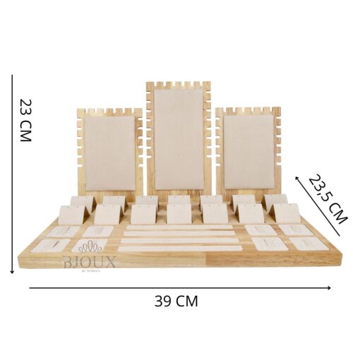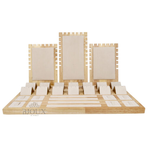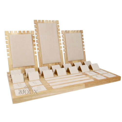 Espositore multiuso con 3 espositoriย in legno per bracciali e collane, 14 card porta orecchini, fessure per anelli a 4 file, 8 basi per anelli/bracciali.