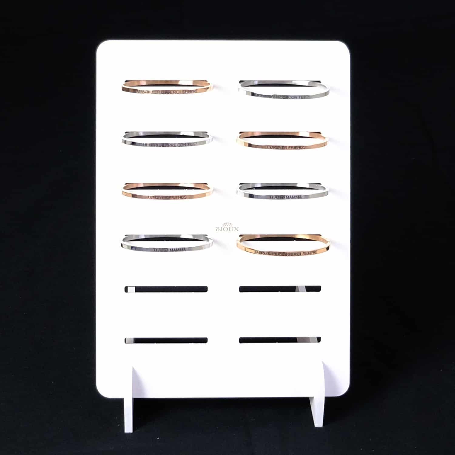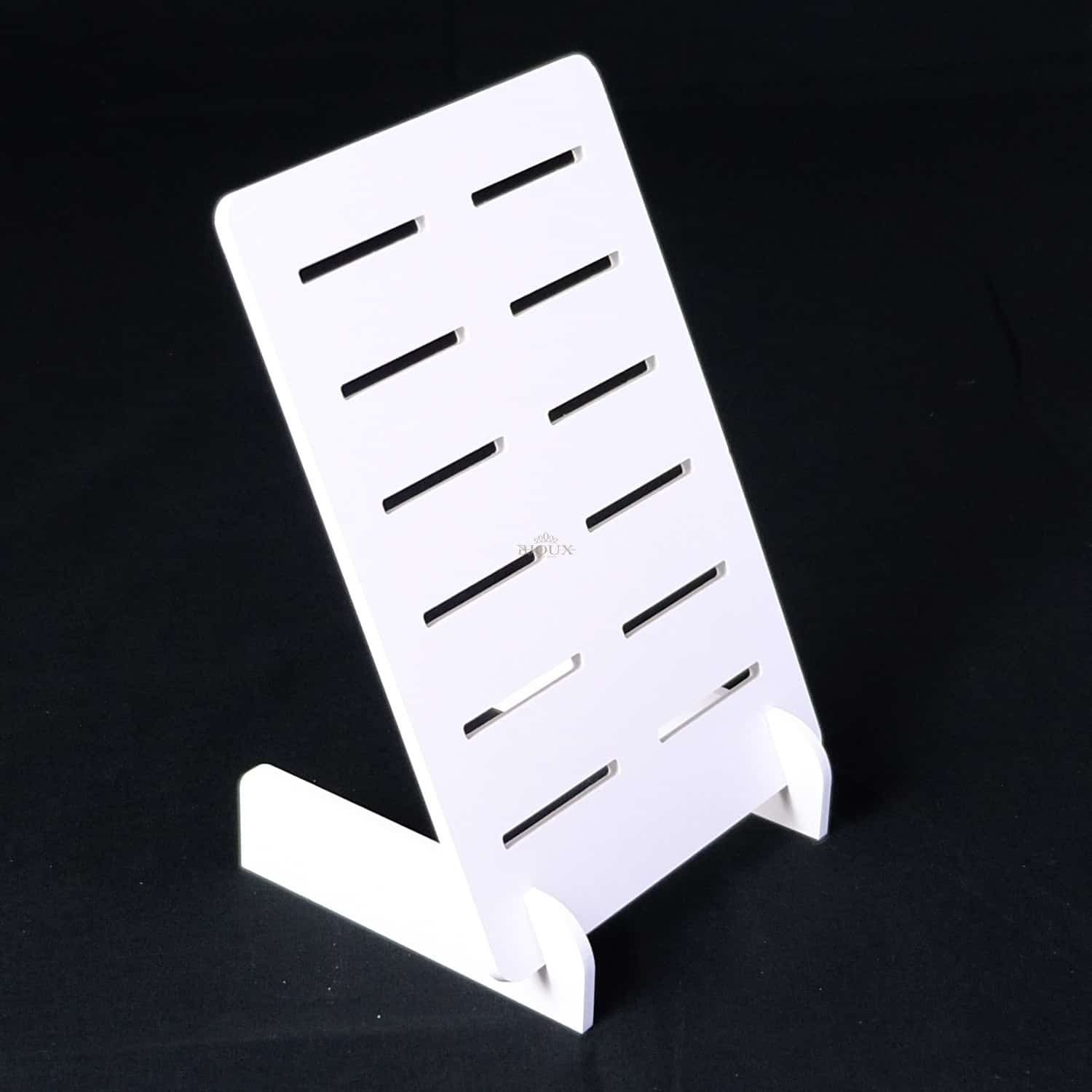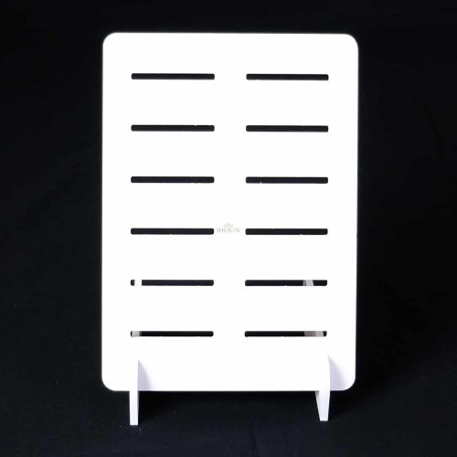 Espositore per gioielli. Espositore per bracciali da vetrina in forex bianco con 12ย spazi. Misure : Altezza 25 cm – Larghezza 18 cm – Piedi 14 cm