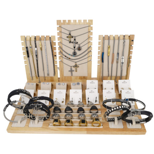 Espositore per bijoux in legno, espositore multiuso con 3 espositoriย in legno per bracciali e collane, 14 card porta orecchini, fessure per anelli a 4 file, 8 basi per anelli/bracciali.