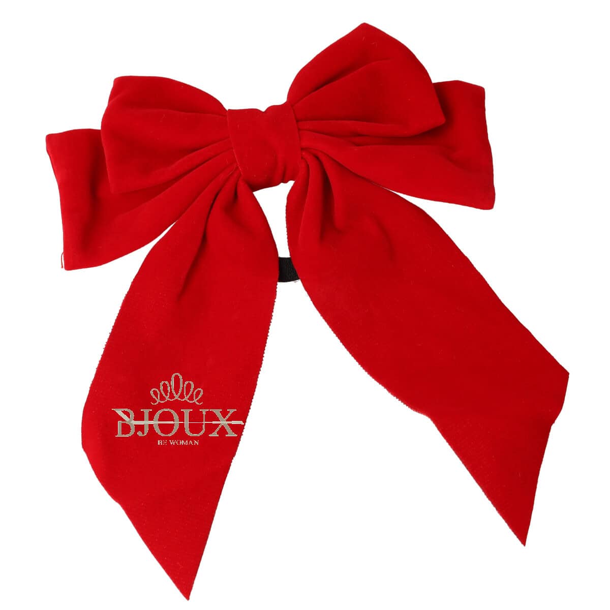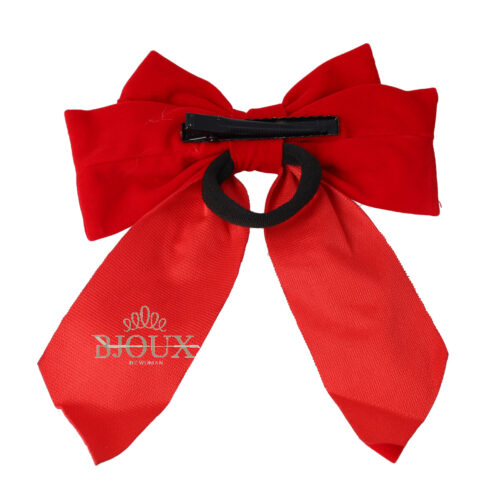 Fermaglio per capelli a forma di fiocco rosso, con pinza ed elastico. In morbido tessuto effetto velluto con codine lunghe. Fiocco da 13 cm e 16 cm lungh